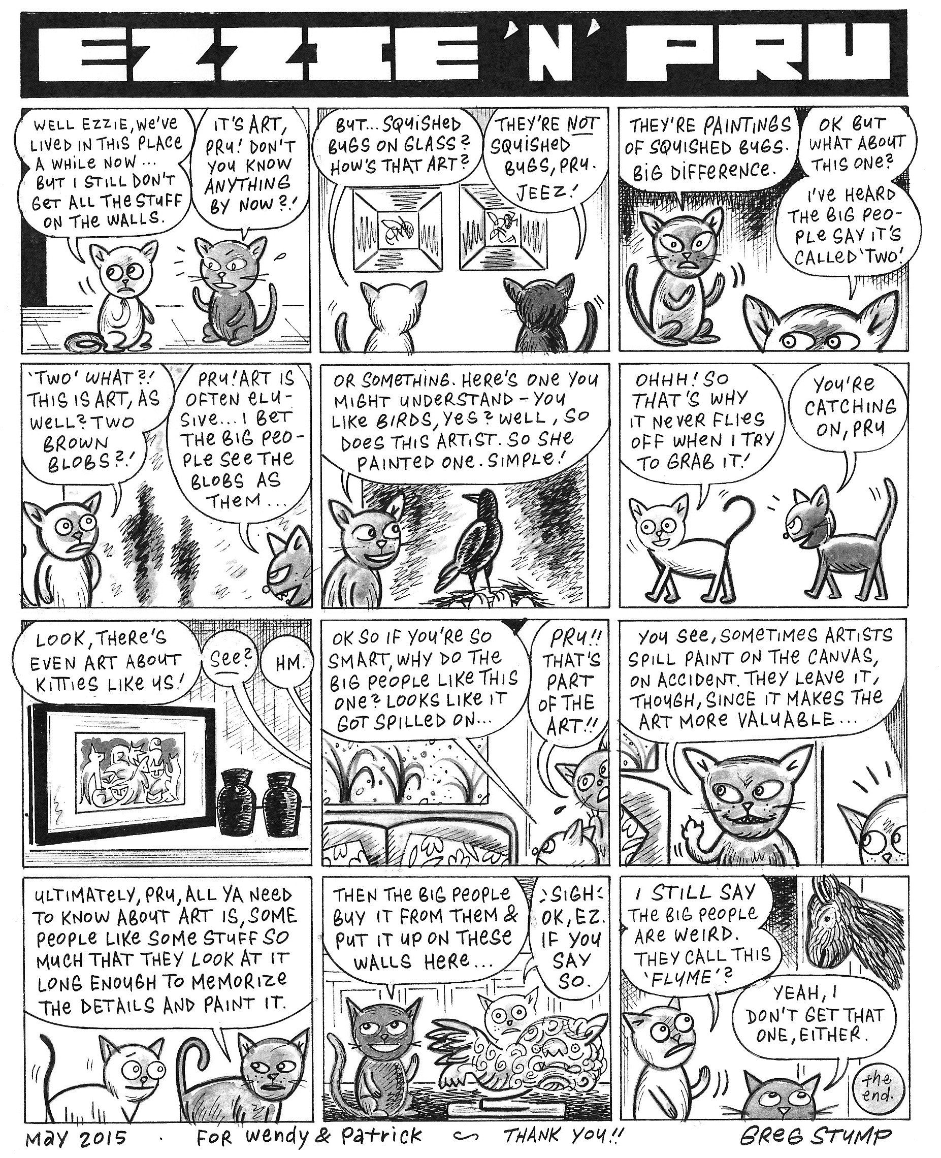 Ezzie and Pru Posted bygreg stumpMay 24, 2015May 24, 2015Posted inComics Sometimes I do commissioned comics. This one above was created for Wendy and Patrick Nazzaro and features their two cats, Ezzie and Pru, commenting on the art on display in their home. Related Published by greg stump Artist, writer, and teacher. View more posts